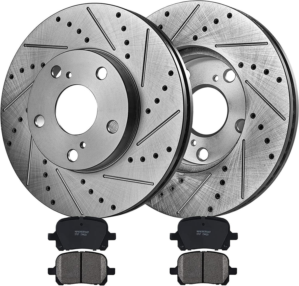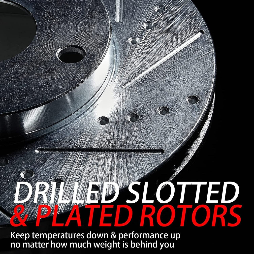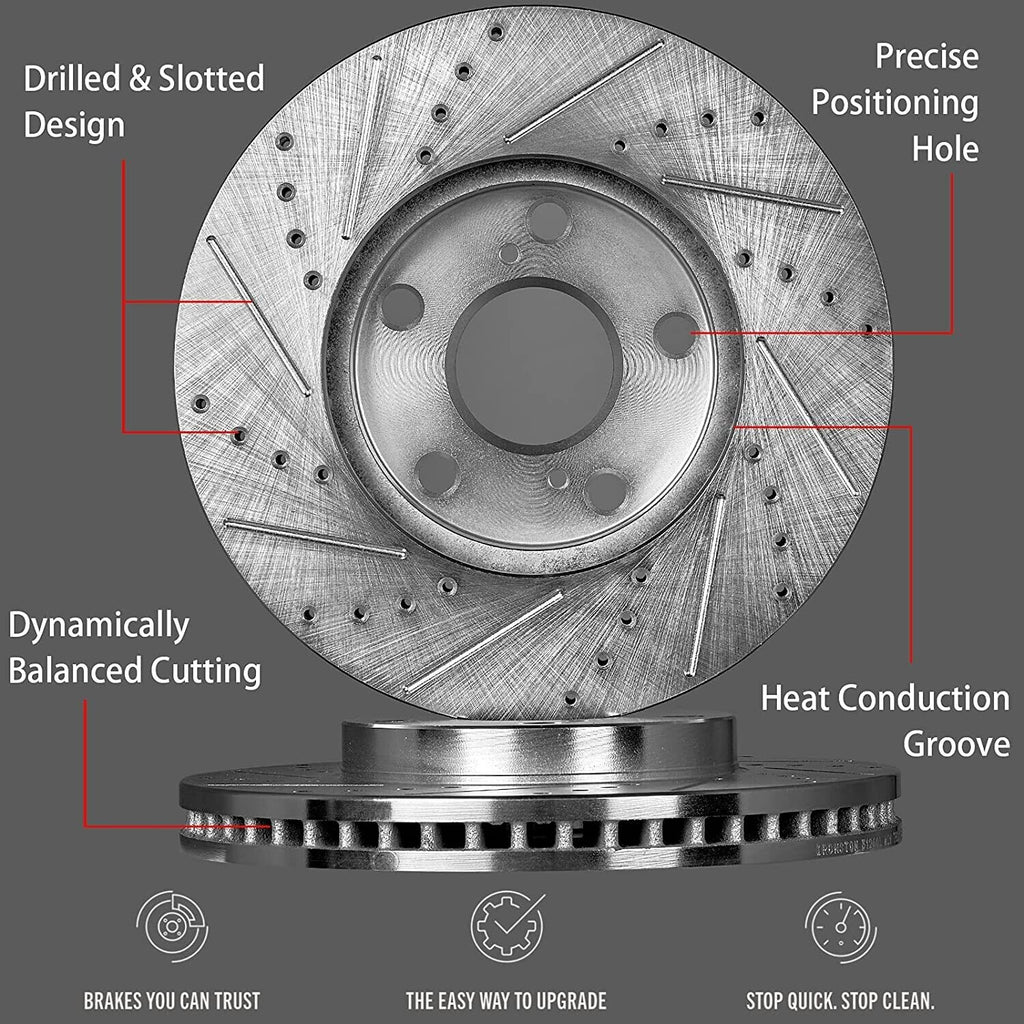 - Drilled and Slotted Disk Brake Rotors, keep temperatures down and performance up. Zinc Dichromate Plating, rust protection. No Cleaner Required.