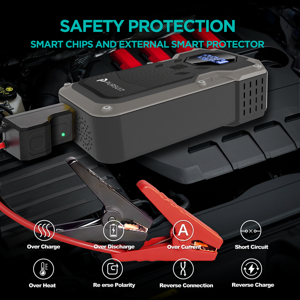 Never get stranded with a dead battery again! The Pursuit R67 2000A Jump Starter delivers massive cranking power to instantly revive 8.0L gasoline or 6.0L diesel engines – perfect for cars, trucks, SUVs, boats, and more. Featuring a built-in air compressor to inflate tires and inflatables, the R67 can jump your car, pump up your tires, and provide backup power to your smartphone or other devices. The ultra-bright LED light offers 3 modes too (steady, strobe, SOS)—ideal for camping, emergencies, or nighttime car repairs.