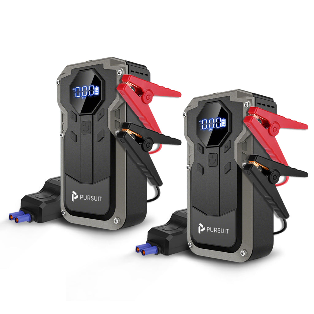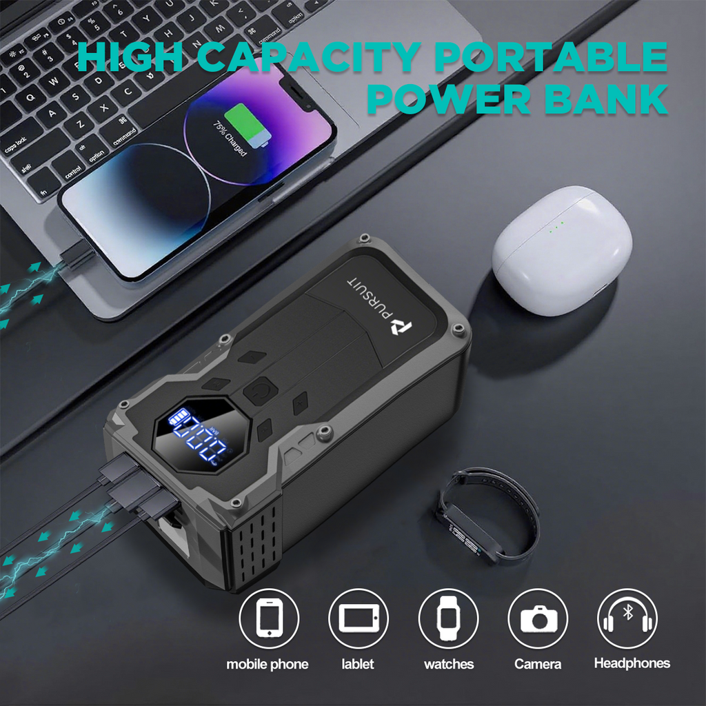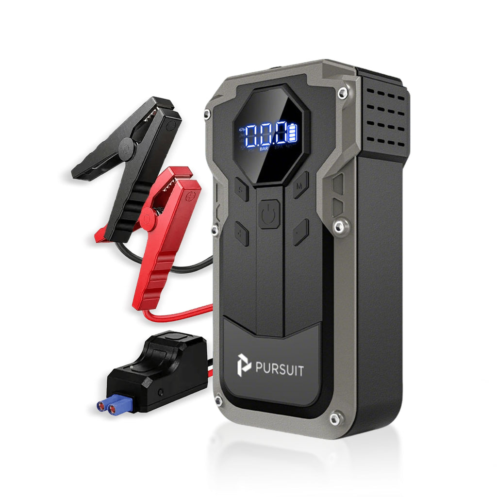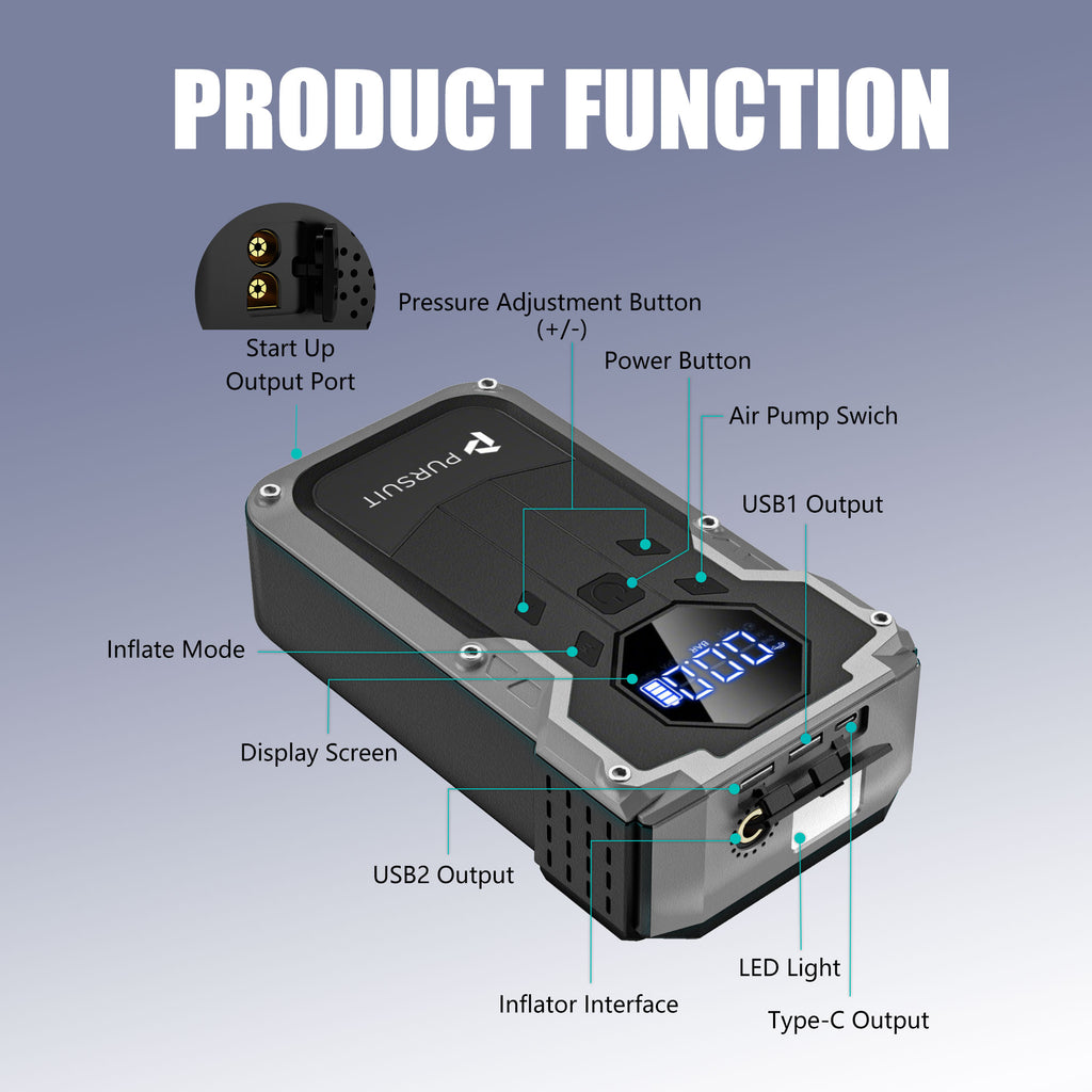 The Pursuit Jump Starter with air compressor has multiple practical functions to meet all your needs, including car emergency jumpstarting, air compressor, 3 light modes (flashlight, SOS warning, strobe), and a power bank (USB ports for charging mobile devices).