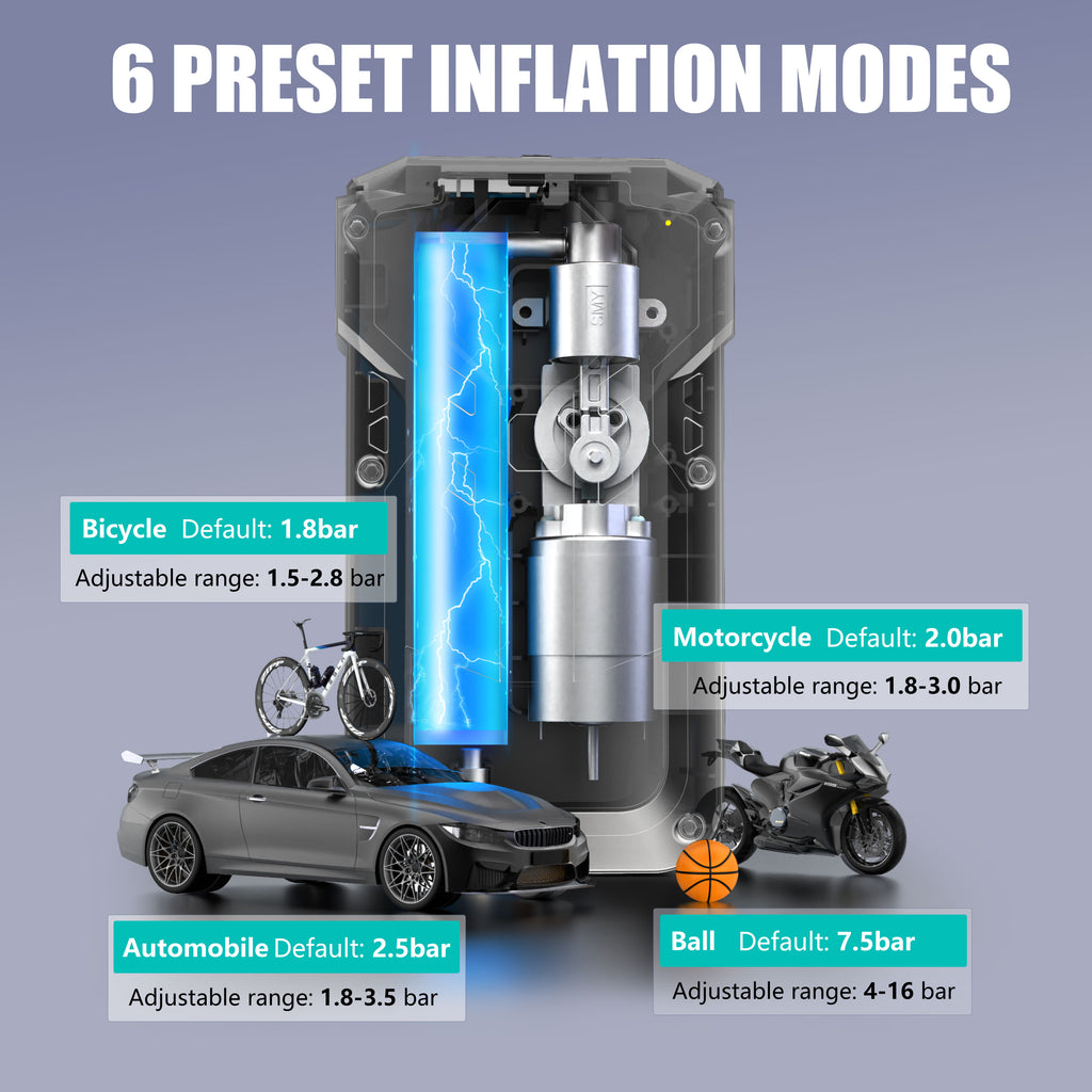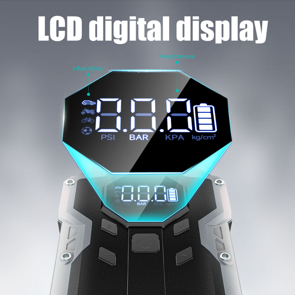 This 150PSI air compressor has 4 preset modes (3 units: PSI, kPa, Bar) to inflate cars, motorcycles, bikes, balls, and inflatables. It automatically stops at your preset value—no need for constant adjustments or monitoring. The air pump’s high-quality cylinder delivers 25L/Min fast inflation, filling a tire from 32PSI to 36PSI in just one minute. The ultra-bright LED light offers 3 modes (steady, strobe, SOS)—ideal for camping, emergencies, or nighttime car repairs.