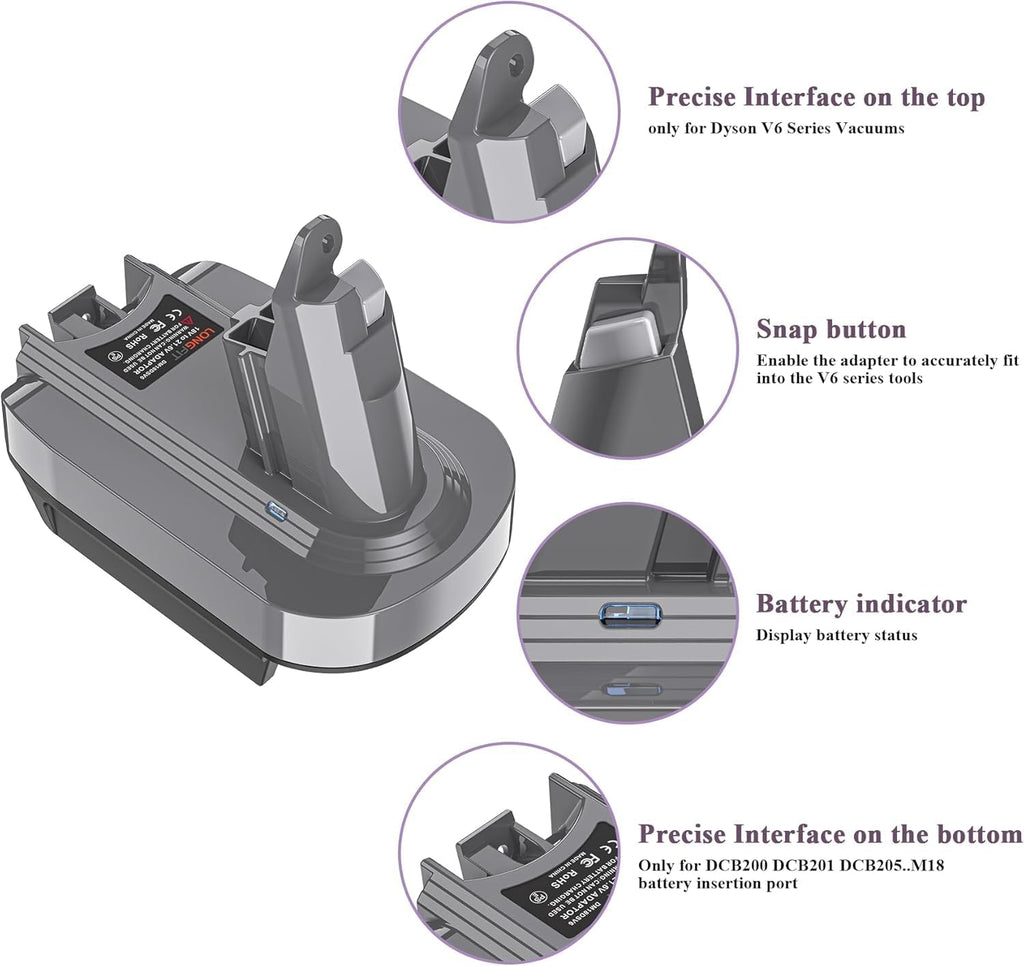 • Replace for Dyson V6 adapted, Converting the dewalt battery or M-18 battery to Dyson V6 batteries only three steps: 1. Remove the original battery from the V6 series vacuum cleaner; 2. Install our V6 adapter into the base of vacuum cleaner; 3. Insert dewalt 18V/ 20V or Milwaukee 18V battery into the base of our adapter, and then you can use the dyson V6 vacuum cleaner as normal. NOTE: Please remove the battery when not in use.