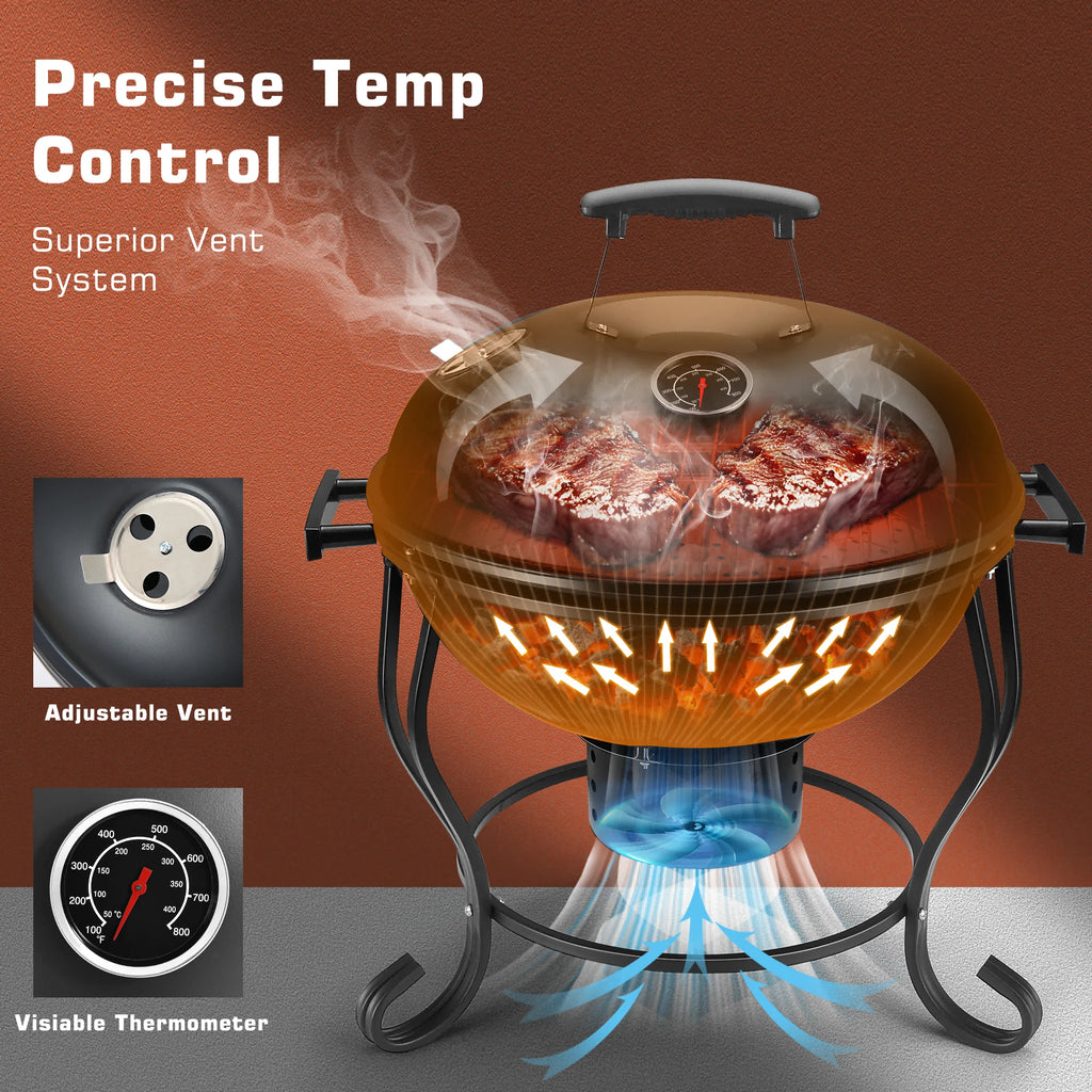 • 【Grill with Adjustable Fan】✅The adjustable fan plays a crucial role in promoting proper airflow and charcoal combustion, promotes faster ignition, so you can start grilling in no time. Further more, resulting in a delightful smoky flavor infused into your food. It also allows you to fine-tune the temperature according to your preference. Whether you want a high heat for searing steaks or a low heat for slow-cooking ribs, this grill has you covered.