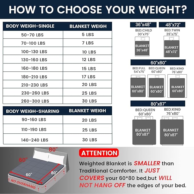 - 【HOW TO CHOOSE SIZE】Weighted blankets for adults, we recommend choosing from sizes 48"x72", 60"x80", and 80"x87". We offer a variety of size options, including Queen, Twin, King and more. For kids, we suggest sizes 36"x48" and 41"x60". PLEASE NOTE that weighted blankets are SMALLER than traditional comforters as they are designed to concentrate the weight on your body rather than hanging off the edges of the bed.