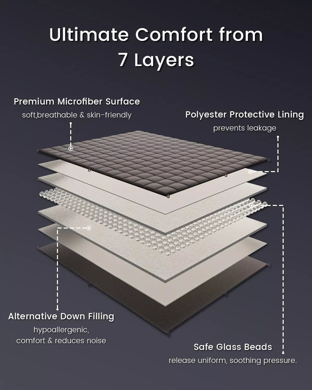 - 【UPGRADED 2.0 VERSION】ZONLI queen size weighted blanket features 5"x5" small compartments. In the 2.0 version, we have upgraded the precision stitching technique, increasing the stitch count and adding two layers of protective lining for the beads. You don't need to worry about bead leakage or shifting. Moreover, the upgraded version uses glass beads that have better heat absorption, ensuring a comfortable temperature throughout the year.