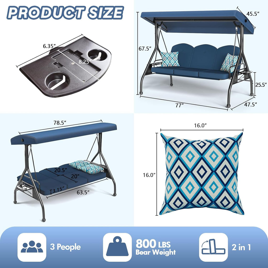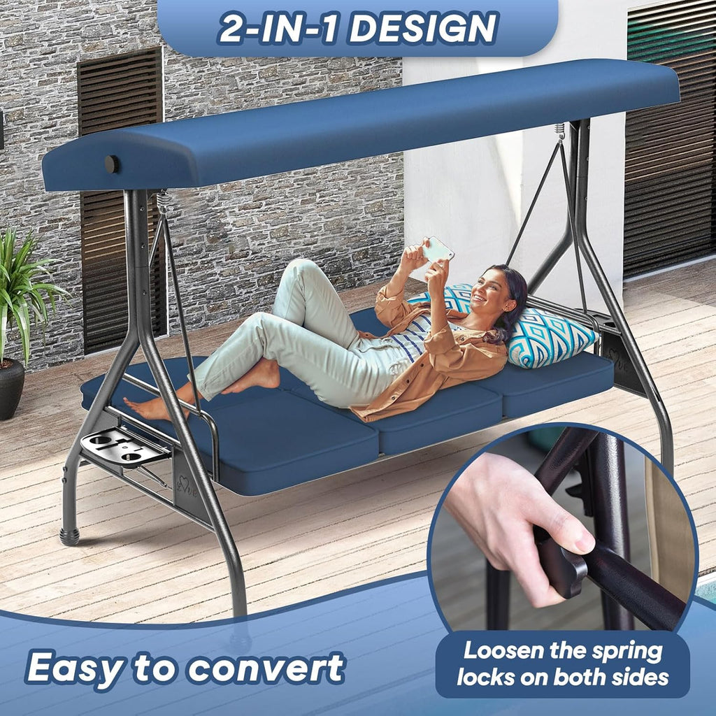 - 【Too few features for a expensive swing?】To meet different needs, our canopy can be adjusted in angle. The 2-in-1 design allows the swing chair to be converted into a swing bed. The deep cup holders can securely put cups and prevent from tipping over