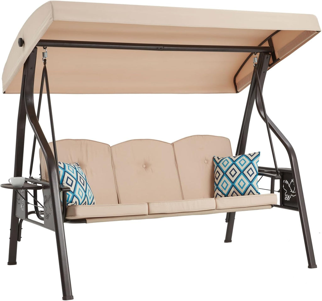 - 【2 in 1 design with 3 seats】-With a few simple operations, we can turn a patio swing chair into a porch swing bed in seconds. 3-seat gives you spacious space and is very quiet when swinging. Special vivid butterfly /eagle carving to add scenery to your yard. Convenient folding cup holders on both sides of bench swing. Put your refreshment. Ideal for children and adults in the backyard or elsewhere!