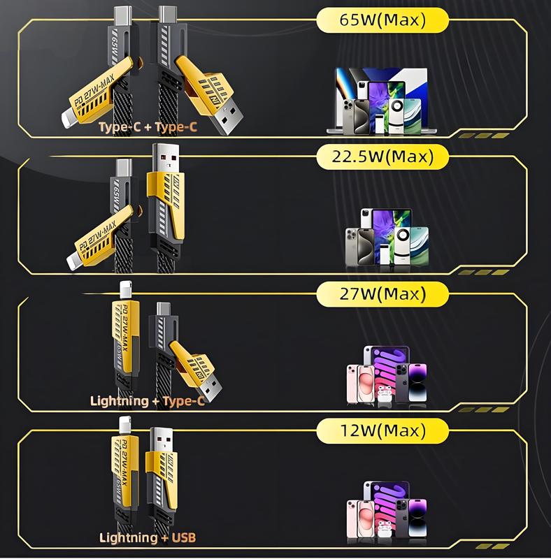 •Includes Type-C to Lightning and 4-in-1 multi-function cables for versatile use.