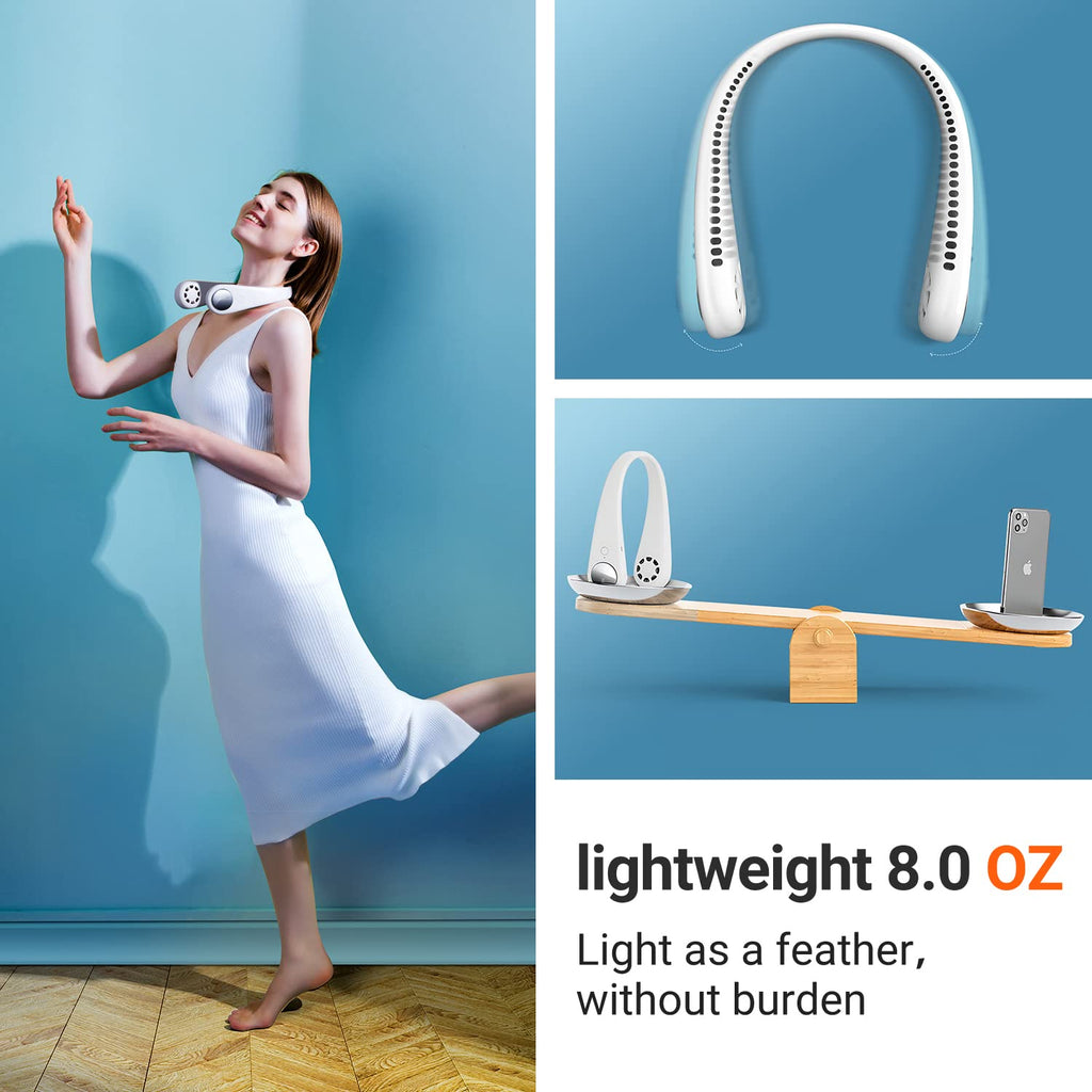 - [Upgrade Design Neck Fan, Free Your Hands] The upgrade bladeless design makes the fan light and fashionable which like a cool headphone. This portable neck fan has many patents, including the unique appearance, the way to generate wind, the wind outlets etc.