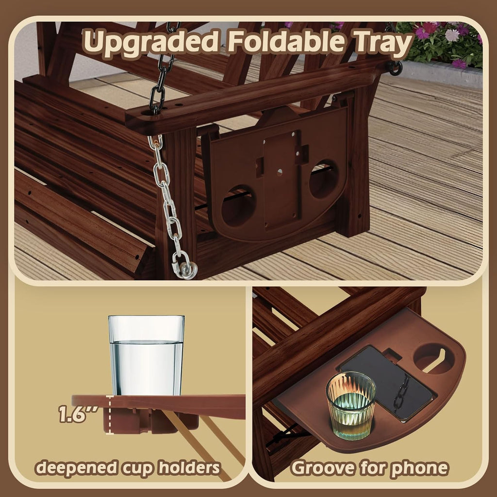 - 【No place to put your cups and phones?】The porch swing is fitted with foldable trays on both sides. We've deepened the cup holders so that your cup can be held more stably. The extra grooves solve the problem of having nowhere to put the phone