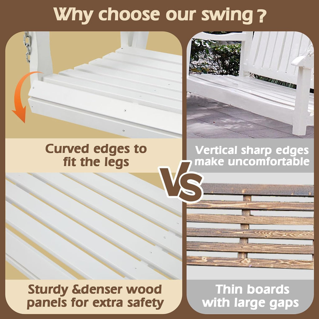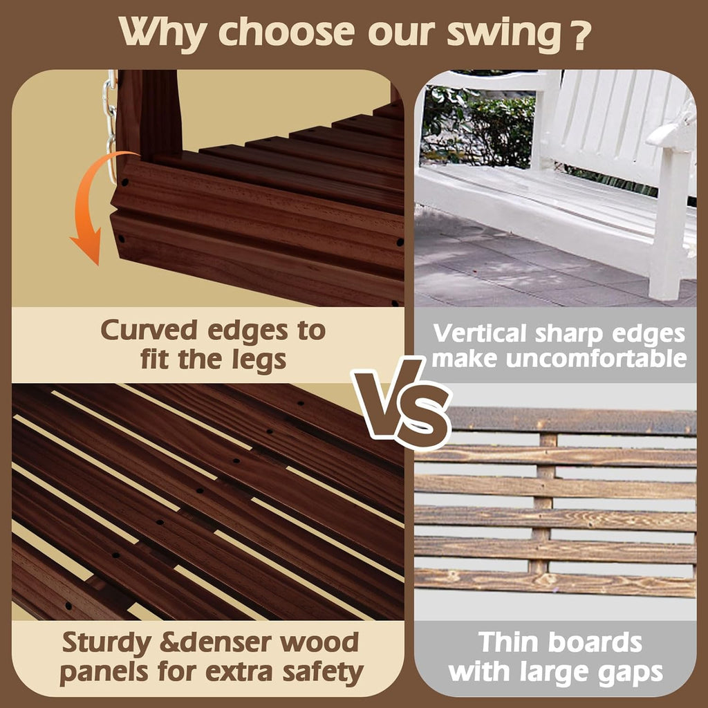 - 【Swings not comfortable enough to sit on?】 Our wooden swings have a smooth burr-free surface and sit 20.5 inches deep to meet most people's needs. The front side of the seat board and handrails are curved to improve comfort and avoid injury